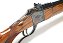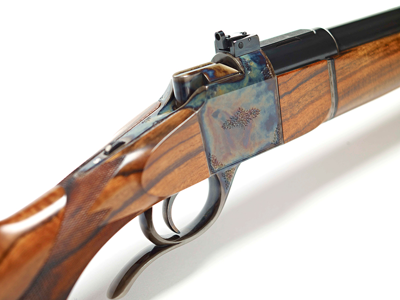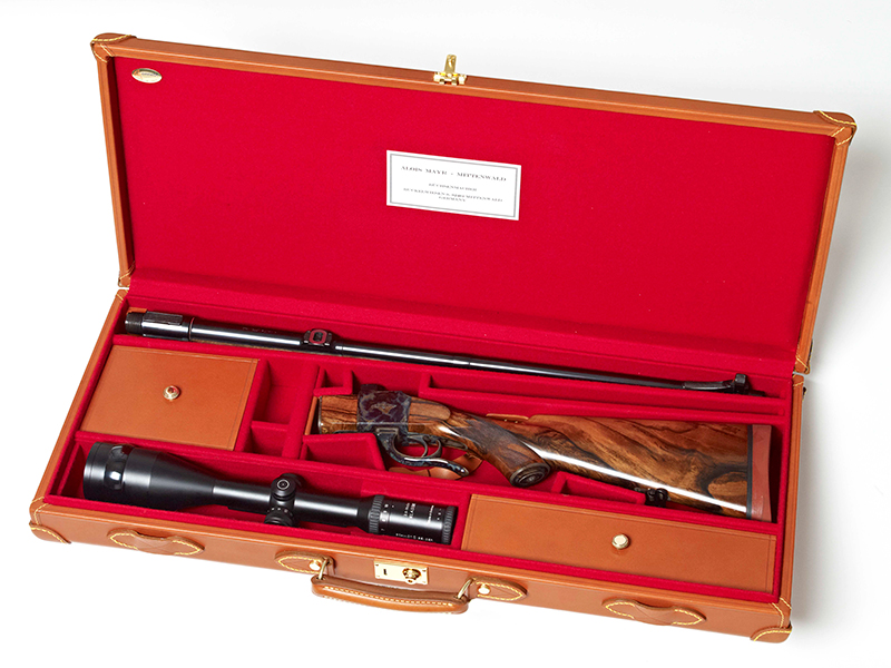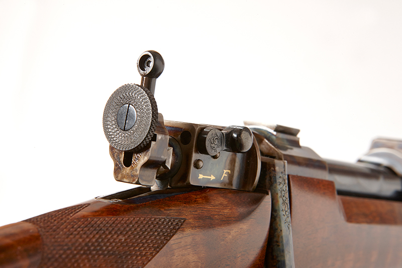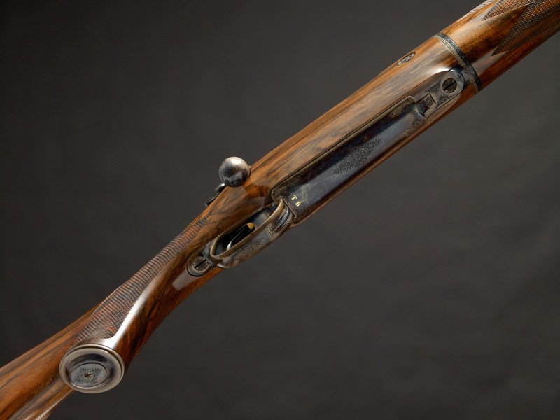 Fischhaut auf dem Kammergriff Tauch- oder Streichbrünierung Abzüge aus rostfreien Stahl Kannelierter Lauf Stahlschaftkappe Exklusives Schaftholz Riemenbügelöse mit 2 Schrauben Lederschaftkappe Schaftfinish matt oder glänzend Feine Fischhaut Jagdmesser passend zur Waffe Waffenkoffer Visierteile als Ring um den Lauf Klappbarer Kornschutz Rigby Diopter |