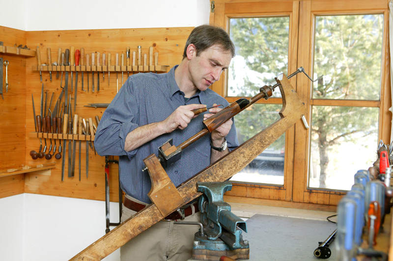 Wo immer es möglich ist, verwende ich moderne Fertigungsmethoden. Viele Arbeiten aber, deren perfekte Ausführung letztendlich die Qualität einer hochwertigen Jagdwaffe ausmachen, sind allerdings nur in aufwändiger Handarbeit zu schaffen. Darunter fallen zum Beispiel das Einpassen des Systems in den Schaft, die fehlerfreie Politur der Metallteile, das Schneiden der Fischhaut und die Ölschliffpolitur des Schafts. Als letzter Schritt wird jede Waffe auf dem eigenen 100 Meter Schießstand mehrmals probe- und eingeschossen. |